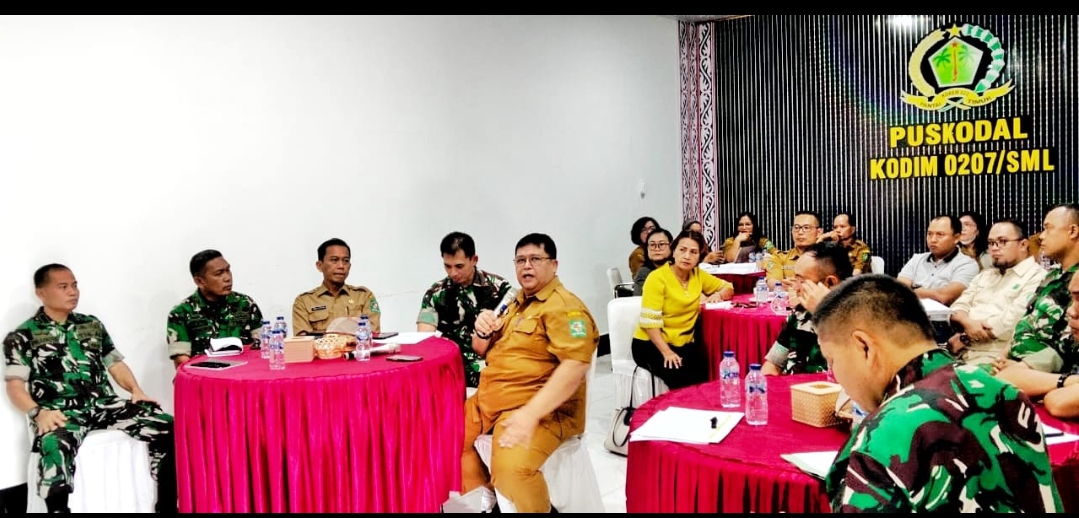 Rapat koordinasi (rakor) dipimpin Sekretaris Daerah (Sekda) Mixnon Andreas Simamora bersama Dandim 0207/Simalungun Letkol Inf Gede Agus Dian Pringgana di ruang Puskodal Koramil 08/Bangun, Selasa (14/4/2026).