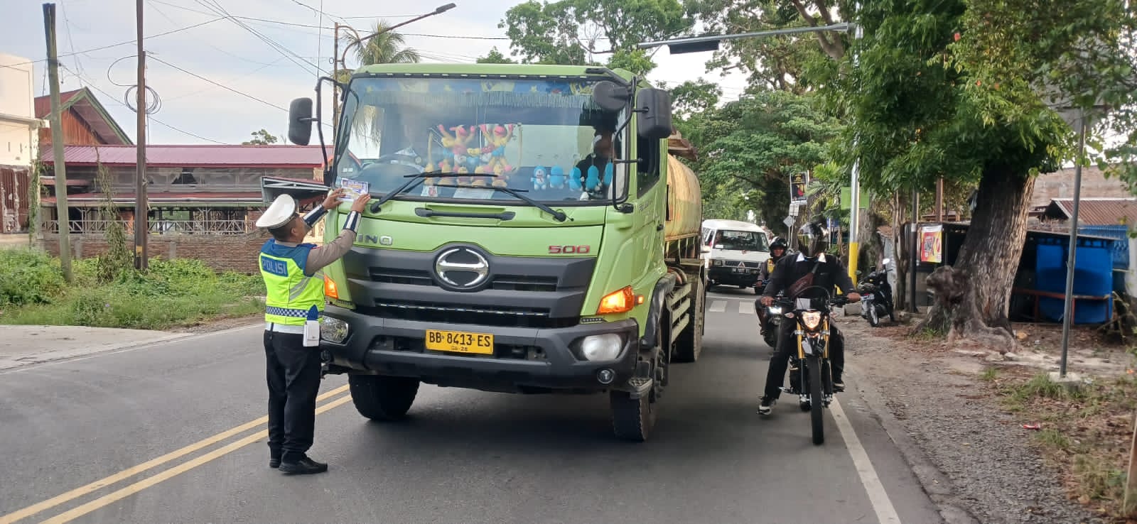 Satuan Lalu Lintas (Sat Lantas) Polres Pematangsiantar membagikan brosur tertib berlalu lintas kepada pengguna jalan, Senin (6/4/2026) pagi.
